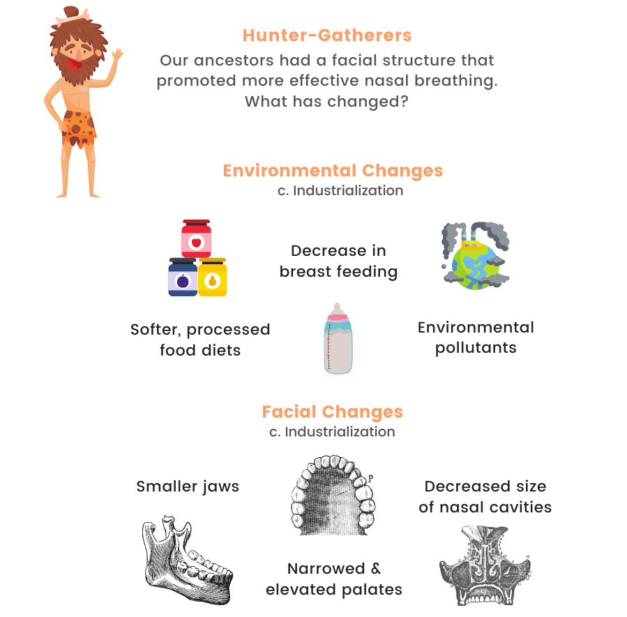 - Dysevolution: Since the industrial revolution, our softer diet has stunted our bone development in our dental arches and sinus cavities leading to chronic conjection. This leads to mouth breathing and thus further congestion. Breathwork be one of the toold to prevent this happening!
